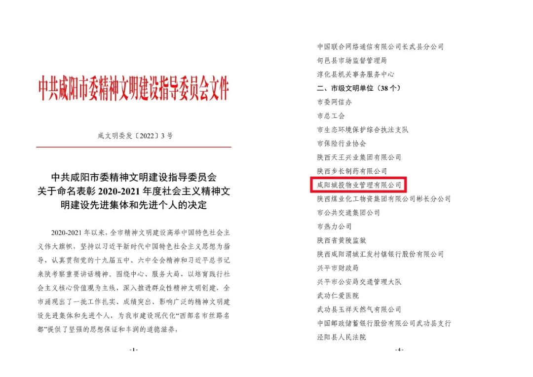 近日,從咸陽市文明辦《關于命名表彰2020-2021年度社會主義精神文明建設先進集體和先進個人的決定》中獲悉,咸陽城投物業(yè)公司被授予市級文明單位榮譽稱號。
